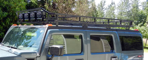 Adventure Accessories is the #1 supplier of Hummer rack and rack accessories for the Hummer H1, Hummer 2 and Hummer 3. our one oiece all welded racks will give you the boost you need to carry your cargo and your trip or camping requirments. the rack will hold up to a 1000 pounds based in the numer of rain gutter brackets and with our different options you can have the looks of the off road in your hummer but also you can get the very agressive looks of the baja pff roading using our Round Baja lights option in your next trip.